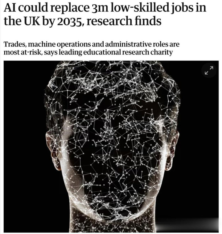 英国国家教育研究基金会(NFER)的一份新报告警告称,到2035年,AI和自动化可能会取代英国多达300万个低技能岗位,尤其是技工、机器操作和行政职位。